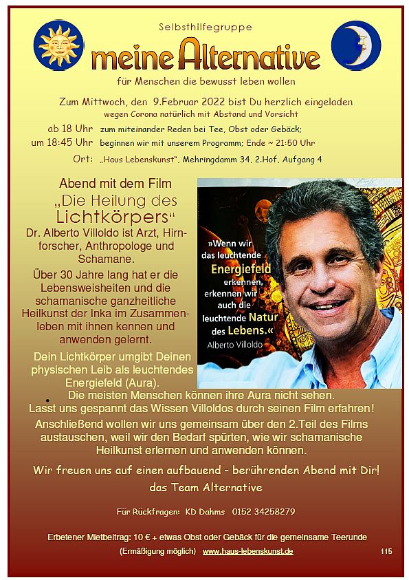 Das Team von "meine Alternative" lädt einmal im Monat mittwochs im Haus Lebenskunst zu einem gestalteten Abend ein, immer mit Gedankenaustausch.