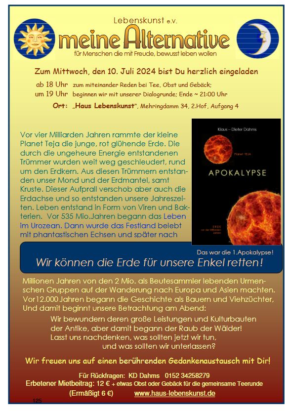 Das Team von "meine Alternative" lädt einmal im Monat mittwochs im Haus Lebenskunst zu einem gestalteten Abend ein, immer mit Gedankenaustausch.